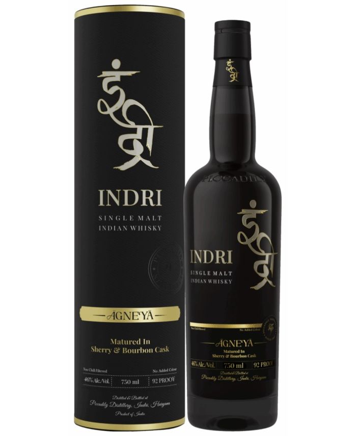 Discover the bold complexity of Indri-Trini Agneya Single Malt Indian Whisky, a 70cl bottle of refined craftsmanship and fiery character. Named after Agneya, the daughter of the fire god in Indian mythology, this whisky embodies both heat and harmony. Distilled in Indri, Haryana, and matured in a unique trio of casks — ex-bourbon, French wine, and PX sherry — Agneya offers a richly layered tasting experience. Expect a nose of charred oak, dried fruits, and toasted nuts, leading into a robust palate of spice, cocoa, and dark berries. Its long, warming finish delivers a perfect balance of smoke and sweetness. Whether you're a connoisseur or a curious sipper, Agneya delivers a rare Indian single malt experience that stands out in any collection.